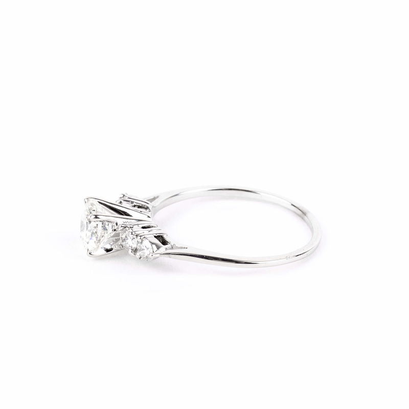 Pre-owned diamond engagement ring crafted in 14K white gold and graced with a round brilliant diamond weighing 1.00 carat and 4, round full cut diamonds with a total weight of 0.25 carats. This stunning ring is currently a size 7.25 and is in very good condition.