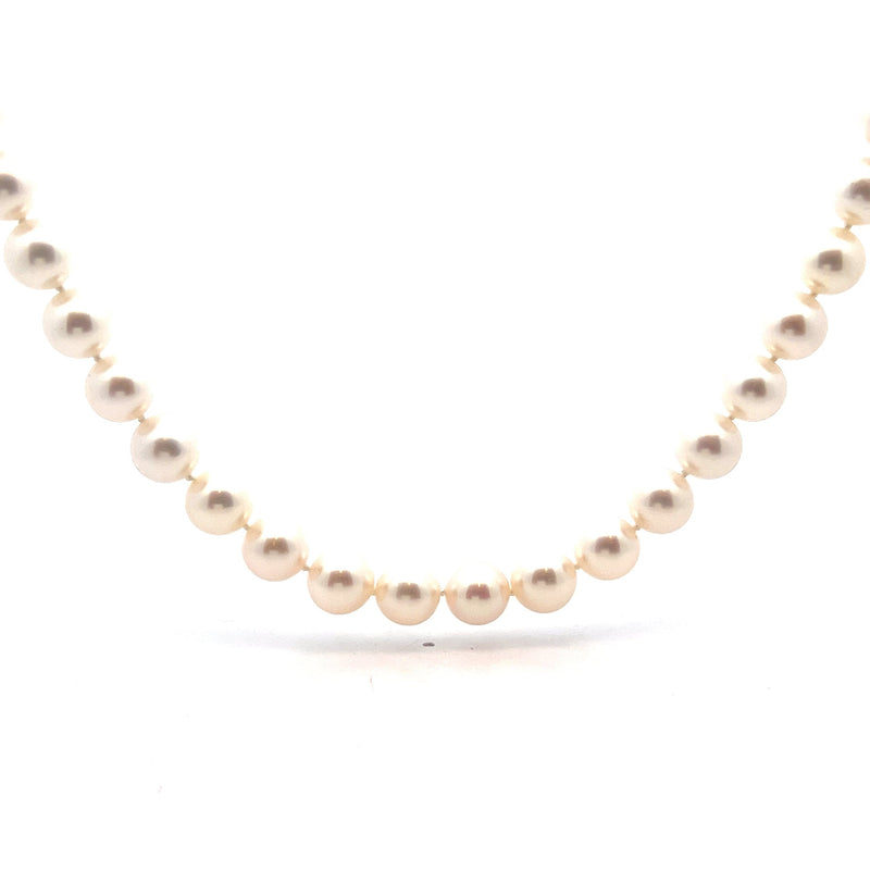 Pre-owned 30 inch strand of Akoya pearls fastened with 18K yellow gold and diamond clasp. This timeless and graceful strand represent the utmost in beauty and is in Excellent condition.