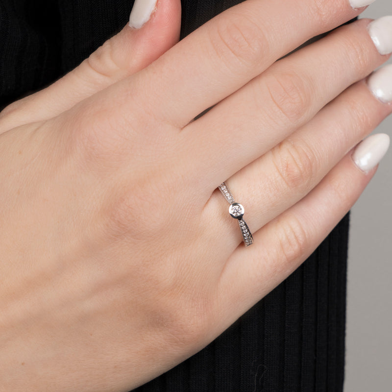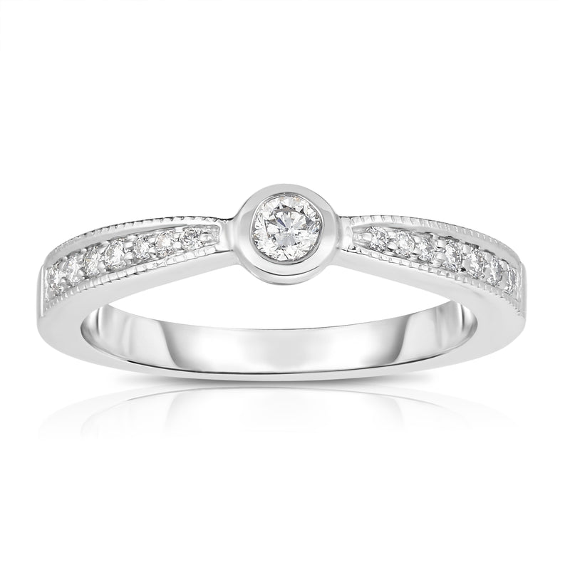 - Main Stone: Diamond (Total Weight; 15 = 0.18 Carats, Clarity; SI-1, Color; I to J, Shape; Round Brilliant)