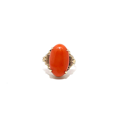 This Pre-Owned Ladies Coral Fancy ring makes a lovely statement piece. The oval coral stone is striking with the 18K yellow gold. Featuring wonderful detail with scrollwork and wire accents, this piece is one-of-a-kind.