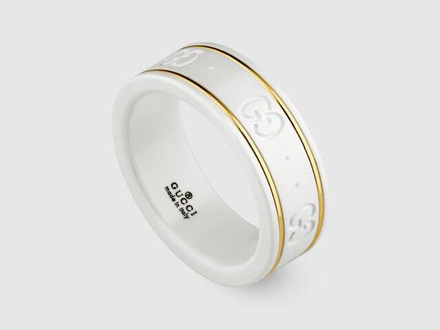 The emblematic GG pattern is engraved onto a white zirconia ring, enriched by 18k yellow gold details for a subtle contrast.