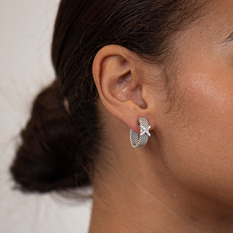 Pre-owned Cede Schmuck Design Mesh hoop earrings crafted in 18K white gold and Stainless Steel and graced with round brilliant diamonds with a total weight of 0.14cts. These simply elegant earrings are sure to turn heads and are in like-new condition.
