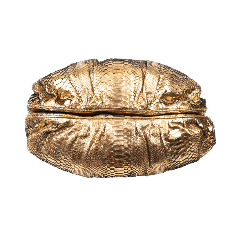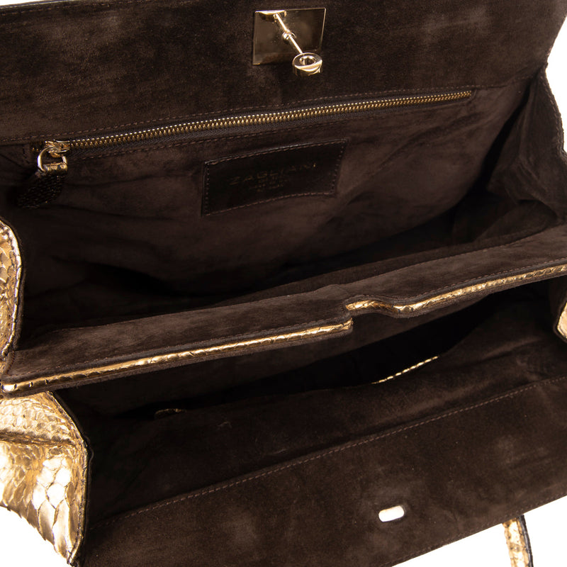 Pre-Owned Python Handbag designed by Zagliani. This antique gold python bag is the ideal representation of Zagliani's iconic design. Worn and loved by celebrities such as Rihanna and Jennifer Lopez, this handbag features gentle pleats and a curved handle. Zagliani's Python Bag is injected with silicon for a voluminous shape to accentuate its functionality and femininity.