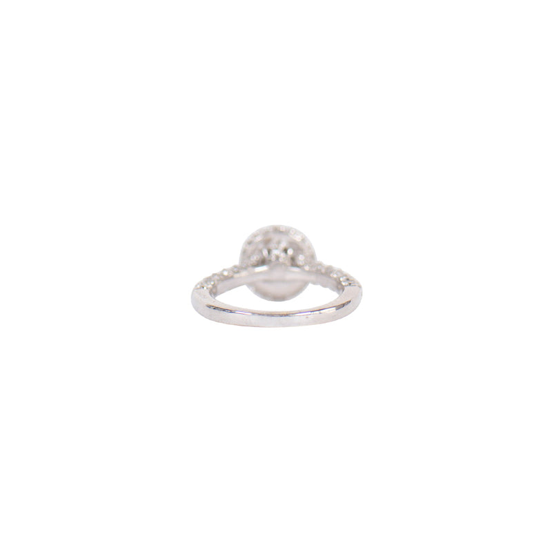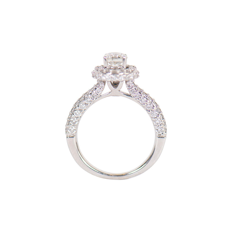 Pre-Owned Ladies Diamond Engagement Ring crafted in 14 karat white gold and graced with a stunning, round brilliant center stone weighing 0.53 carats, G to H in color, and SI-2 in clarity. Additionally, this ring is detailed with 98, dazzling round full cut diamonds with a collective carat weight of 1.00 carats. Ring is in very good condition.